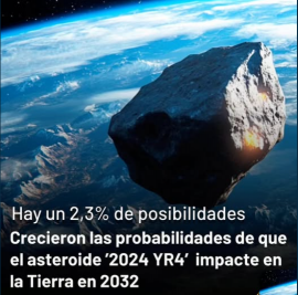 El Centro de Estudios de Objetos Cercanos a la Tierra (CNEOS) de la NASA advirtió que subieron a 2,3% las probabilidades de que el asteroide 2024 YR4 impacte contra la Tierra el 22 de diciembre de 2032. Hace una semana, el riesgo de impacto del meteorito era de 1,3%. El objeto, el cual tiene un tamaño de entre 40 y 90 metros de diámetro, fue clasificado con un nivel 3 en la Escala de Turín, un sistema que mide la peligrosidad de los objetos cercanos a la Tierra en una escala del 0 al 10.   @primiciasarrecifes